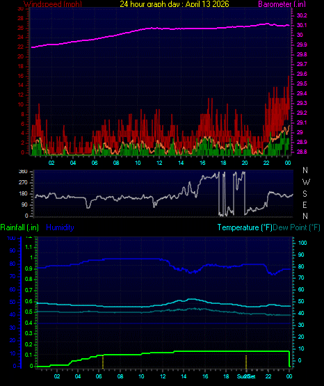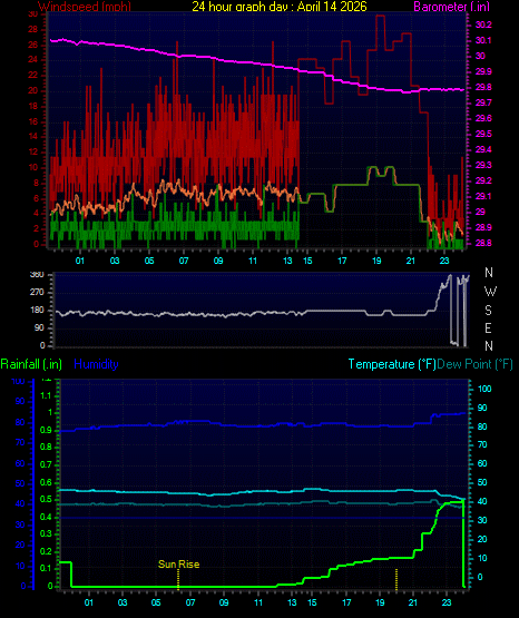 Maximum windspeed = 12.7 mph from 142°( SE) on day 14 at time 05:40